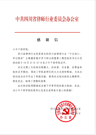 培训结束后,四川省律师行业党委办公室特致学院感谢信。
